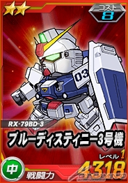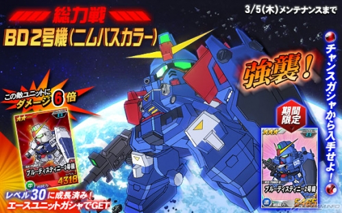 同機を倒した際に引くことができるチャンスガシャには「★3 ブルーディスティニー2号機」などを獲得できるチャンスがあるほか、エースユニットガシャには「ブルーディスティニー2号機(ニムバスカラー)」に対し6倍の攻撃力を発揮する「★2 ブルーディスティニー3号機」が追加される。