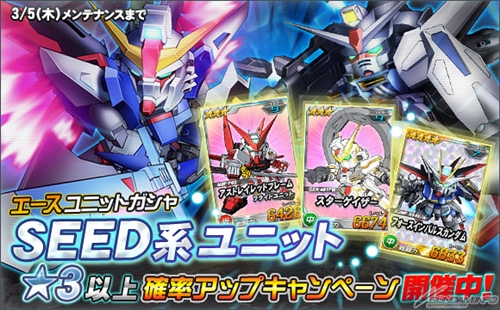 キャンペーン期間中は、「エースユニットガシャ」、および「11連エースユニットガシャ」から出現する「機動戦士ガンダムSEED系ユニット」のうち、「★3」以上のユニットの排出確率がアップする。