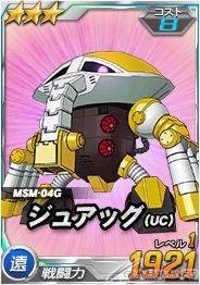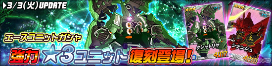 エースユニットガシャに、「★3 クシャトリヤ」、「★3 シナンジュ」、「★3 ジュアッグ(UC)」、「★3 ゾゴック(UC)」など、強力なユニットが多数登場した。スペシャルウェポンとして「★3 クシャトリヤ」は「ファンネル」を、「★3 シナンジュ」は「ウェポン・コンビネーション」を搭載する強力なユニットとなっているので、ぜひとも手に入れよう。