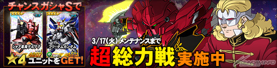 同機を倒した際に引くことができるチャンスガシャSには「★4 フリーダムガンダム」や「★4 ガンダム試作一号機フルバーニアン」などを獲得できるチャンスがあるほか、エースユニットガシャには「フル・フロンタル搭乗シナンジュ」に対し3倍の攻撃力を発揮する「★2 ユニコーンガンダム(NT-D)」が追加される。