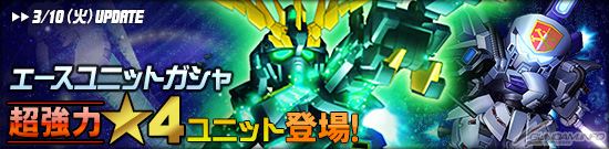 エースユニットガシャに「★4 バンシィ(覚醒)」、「★4 ビギナ・ギナ」、「★3 ガンダムエクシアリペアII」が登場した。強化パーツとして、「★4 バンシィ(覚醒)」は「フルサイコ・フレーム」を、「★4 ビギナ・ギナ」は「フィン・ノズル」を搭載した強力なユニットとなっているので、ぜひとも手に入れよう。