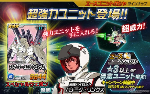 さらに、エースユニットガシャに「★3 フルアーマー・ユニコーンガンダム」が追加されたほか、「ホワイトデーログインボーナスキャンペーン」など4つのキャンペーンも同時にスタートしたのであわせて紹介していこう。