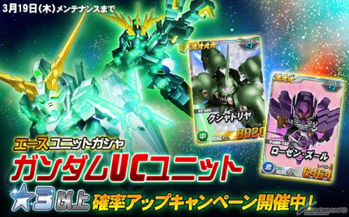 イベント期間中は、「エースユニットガシャ」および「11連エースユニットガシャ」から出現する『機動戦士ガンダムUC』シリーズのユニットのうち、「★3」以上のユニットの排出確率がアップする。