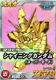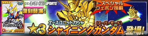 エースユニットガシャに、スペシャルウェポンとして「シャイニング・フィンガー・ソード」を搭載した「★3 シャイニングガンダム(スーパーモード)」や「★3 マンダラガンダム」など、強力なユニットが多数追加された。また、「★4 シャイニングガンダム」が復刻登場しているので、ぜひとも手に入れよう。