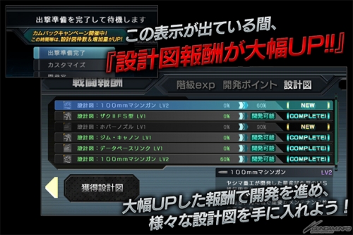 そして「カムバックキャンペーン」では、期間中の特定の時間帯において全てのゲームルールで戦闘報酬の設計図枠が増加するほか、設計図の完成率増加量が2倍になる。