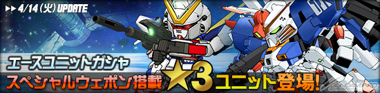 エースユニットガシャに、「★3 V2ガンダム」、「★3 Ex-Sガンダム」、「★3 Vダッシュガンダム」などが登場した。スペシャルウェポンとして、「★3 V2ガンダム」は「光の翼」を、「★3 Ex-Sガンダム」は「リフレクター・インコム」を搭載した強力なユニットとなっているので、ぜひとも手に入れよう。