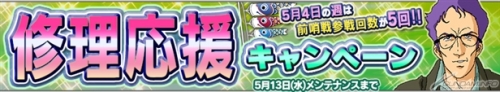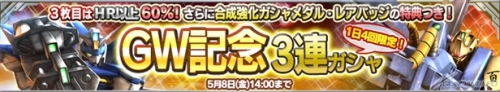 GWを記念した豪華ラインナップのガシャが登場。1日4回限定で、3枚目はHR以上の出現率が60%となる。また、「合成強化ガシャメダル×3枚」と「レアバッジ×1個」が特典としてつく。