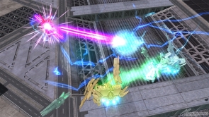 ▲大型ブースター分離後の特殊格闘では、サイコ・フレームを共鳴させ、自機周辺にいる機体をしびれさせる。それと同時にファンネル・シールドによる攻撃も行われる、攻防一体の技だ。