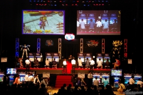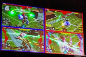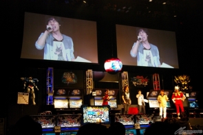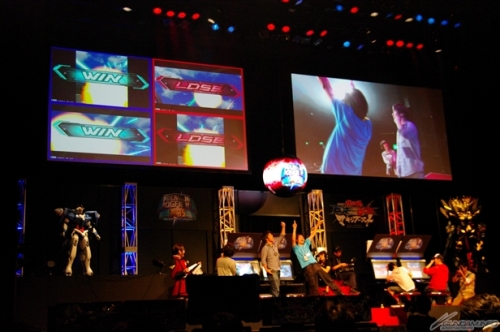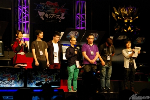 予選後に行われたステージアトラクションでは、まず始めに今回初参戦となった海外勢が紹介された。香港のゲームセンターで大勢のプレイヤーが「EXVS.MB」を取り囲んでいる映像なども上映され、本作が各地で遊ばれている様子をうかがうことができた。