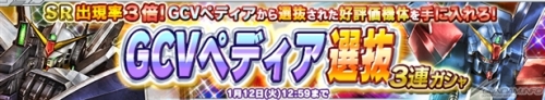 Choice four-star and above suits, pilots, and support cards from the GCVPedia are available in this lineup. It's available up to five times a day, and the SR rate is triple normal.
