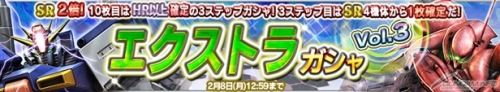A three-step 10-card gasha, with each step available once a day. SR rates are doubled; on your second pull of the day the 10th card is guaranteed to be at least an HR, and on your third it will be chosen from the SR ZZ Gundam, SR Gerbera Tetra, SR Susanowo, or SR 00 Gundam.
