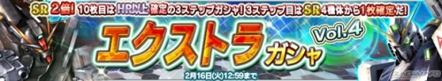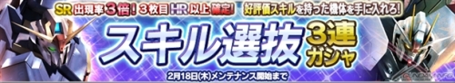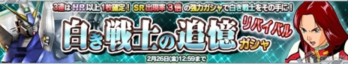 A three-step 10-card gasha, with each step available once a day. SR rates are doubled; on your second pull of the day the 10th card is guaranteed to be at least an HR, and on your third it will be chosen from the SR Nu Gundam, SR Sazabi, SR Strike Noir, or SR Providence Gundam.