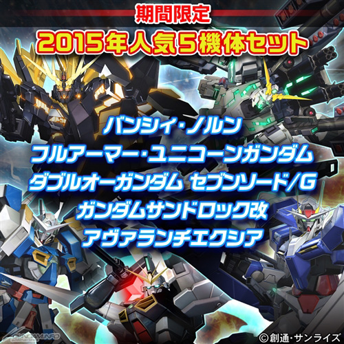 A full set of 12 playable mobile suits released in 2015. Get all the latest suits for just ¥2,856!