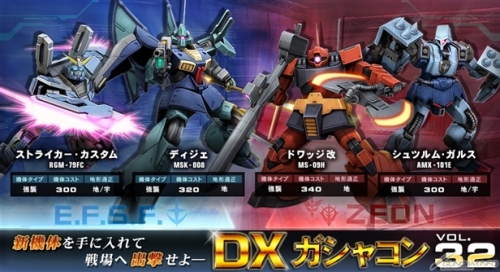 本ガシャコンでは、「Ζ PROJECT」にて先行公開されていた「ディジェ」やドム最終生産タイプを改修した「ドワッジ改」をはじめ、「ストライカー・カスタム」や「シュツルム・ガルス」が登場する。詳しくは、ゲーム公式サイトの 「DXガシャコンvol.32」特設ページをご覧ください。