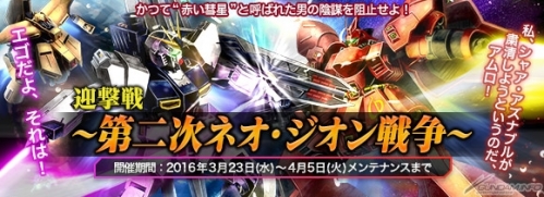 期間中、特別バトル「迎撃戦」が出現し『機動戦士ガンダム 逆襲のシャア』に登場する機体の数々が強敵となって立ちはだかる。また、今回はルール改修も実施され、ステージごとにEASY / NORMAL / HARDと難易度が設けられ、始めたばかりのプレイヤーも迎撃しやすくなった。開催期間は4月5日(火)メンテナンス開始まで。