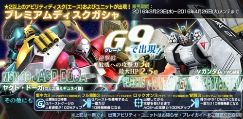 ガシャステーションの内容が更新され、「νガンダム(HWS装備)」、「ヤクト・ドーガ(クェス機&ギュネイ機)」など計4ユニットが目玉機体として登場。いずれも同時開催中の迎撃戦「第二次ネオ・ジオン戦争」で役立つ特効ステータスが付く。さらに、出現ユニットは「GRADE9」に改修済みの状態で出現し、初回限定1回100コインで利用できる。加えて、1日1回限定で10回(3000コイン)利用時にゲーム内資金300万がオマケで付いてくるタイプも用意されているので、この機会をお見逃しなく。販売期間は4月26日(火)メンテナンス開始まで。