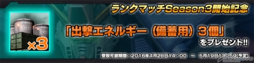 ランクマッチSeason3開始を記念して「出撃エネルギー(備蓄用)3個」がプレゼントされ、ランクマッチSeason3期間中に遊ぶと受け取れる。開催期間は5月19日(木)13:59までの予定。