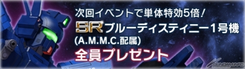 月刊ガンダムエースにて連載中の「機動戦士ガンダム外伝 ザ・ブルー・ディスティニー」に登場する「ブルーディスティニー1号機」を、プレイヤー全員にプレゼント中。本MSは、開催中のΖガンダムイベント「宇宙のぬくもり」の特効持ちとなっている。ぜひとも部隊に編成して、イベントに臨もう。