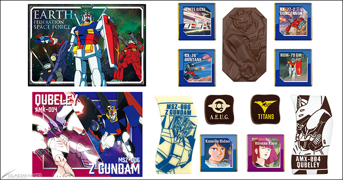 Tous ont des designs avec les combinaisons mobiles et des personnages deMOBILE SUIT GUNDAMEtMOBILE SUIT Z GUNDAMsur l’emballage et les chocolats.La gamme a une grande variété, y compris des ensembles de chocolat, du chocolat en canettes et du chocolat dans des caisses.