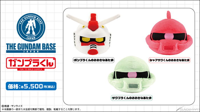 La peluche Grosse Tête de GUNPLA-KUN, la Peluche Grosse Tête de ZAKUPLA-KUN et la Peluche Grosse Tête de CHARZAKU-KUN seront lâchées à THE GUNDAM BASE, dans les locaux généraux de GUNPLA à partir du samedi 19 octobre. Chaque peluche sera disponible pour 5 500 JPY (taxes incluses).