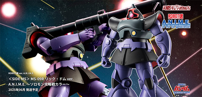Les précommandes pour le ROBOT SPIRITS Rick Dom ver. A.N.I.M.E. ~The Glory of Solomon Color~ commencent le vendredi 22 novembre à 16h00 JST sur la boutique en ligne TAMASHII au sein de Premium Bandai. Cet article devrait être expédié en juin 2025 et sera disponible au prix de 8 250 JPY (taxes incluses).