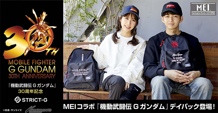 Pour célébrer le 30e anniversaire deMobile Fighter G Gundam, les sacs à dos sortent en collaboration avec MEI, une marque de plein air basée à Huntington Beach, une ville de surf sur la côte californienne, aux États-Unis, où se mêlent sport et culture.