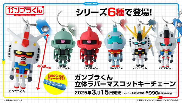 Au total, six types de porte-clés mascotte en caoutchouc 3D GUNPLA-KUN seront mis en vente le samedi 15 mars. Ils seront chacun disponibles pour 990 JPY (taxes incluses).