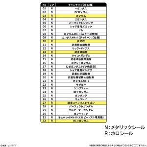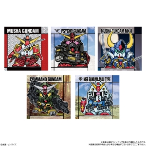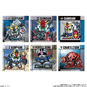 La gamme compte 32 types au total, dont le Gundam, le Musha Gundam et le Knight Superior Dragon. Les arrière-plans des autocollants sont basés sur les arrière-plans de l’emballage original de SD Gundam, et cinq types d’autocollants holographiques incluent une illustration originale du Hi-ν Gundam par l’artiste Koji Yokoi, ce qui en fait un ensemble luxueux.