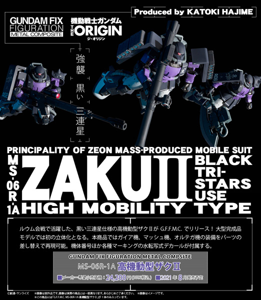 Le Zaku II types de mobilité élevé proposés dans Mobile Suit Gundam : l’origine utilisée par Gaia, Ortega et moût de Black, également connue sous le nom de tristars noirs, sera disponible pour la première fois sous la forme de modèles volumineux pré-assemblés supervisés par Hajime Katoki.