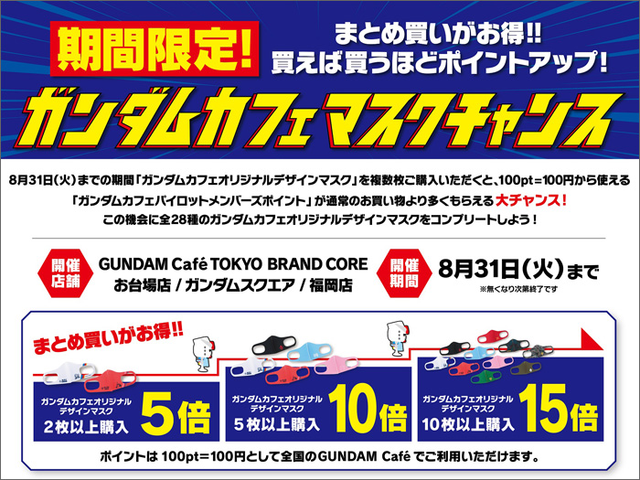 Au cours de cette campagne, les clients qui achètent plusieurs masques de conception originale de GUNDAM café (825 yens chacun, taxes incluses) recevront plus de points de membres de GUNDAM café Pilot que d’habitude.Les clients recevront cinq fois le montant habituel lors de l’achat de deux masques ou plus, et dix fois plus de points lors de l’achat de cinq et au-dessus des masques.