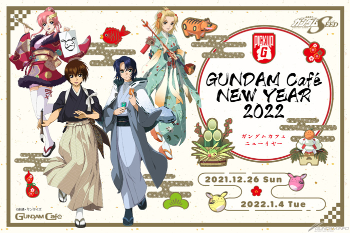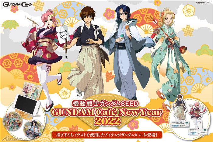GUNDAM café nouvel an 2022 est une foire où vous pouvez célébrer la nouvelle année avec quatre personnages deMOBILE SUIT GUNDAM SEED: Kira Yamato, Athrun Zala, Cagalli Yule Athha, et Lacus Clyne.