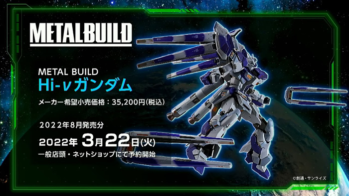 Pré-commandes pour la construction de métal Salut-ν Gundam qui vont en vente en août 2022 débutera dans les magasins de détail généraux et les magasins en ligne le mardi, Mars 22nd, 2022.Il sera disponible pour 35 200 JPY (taxes incluses).
