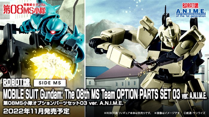 De ROBOT SPIRITS ver.A.N.I.M.E. qui intertisse la dernière technologie de CAO et l’artisanat des modeleurs dans leurs figures de robot, le 08ème MS équipe option pièces set 03 qui va en vente en novembre.es en vente en novembre. Il sera disponible pour 5