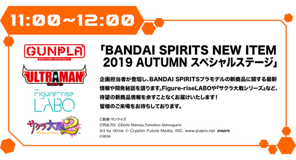 Sur la scène principale à partir de 11h00 le 29 septembre, 2019 (soleil), de nouveaux produits, y compris gunpla et les dernières informations et des histoires de fond de développement seront racontés sur le "BANDAI SPIRITS NEW ITEM 2019 AUTUMN Spéciale Stage".