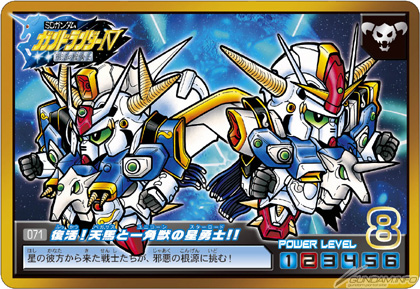 にくきゅう | 「SDガンダム アルティメットバトル」では、 幻の4体の星勇士(スターロード)がカード化されています。 当時から商品化されなかった星勇士もまだまだ存在するので、 この次に期待したいですね。 |
