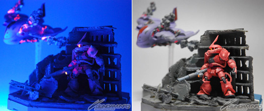 I tried to recreate that famous scene from 'Garma's Fate'. Char's Zaku has been rebuilt for mobility and repainted in places. Its weapon has been switched with a bazooka. I used a 1/1200 Gaw. Before photographing with a blacklight, I painted the parts I didn't want to glow with UV-absorbent paint.