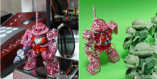This is a decorated Zaku. It uses 1,600 stones; it's almost an objet! It came out a little overdone at first, so I lengthened it with ball joints. The neck, shoulders, hips, and waist all move.