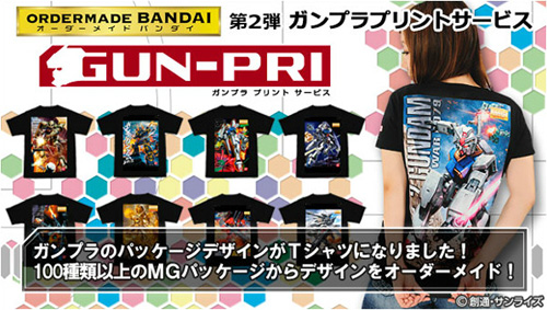 The second product in our 'Order-Made Bandai' series, the Gunpla print service 'Gunpri' which allows you to custom-print a T-shirt, wallscroll, or bath towel with your choice of Gunpla package illustrations, is now available.