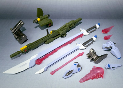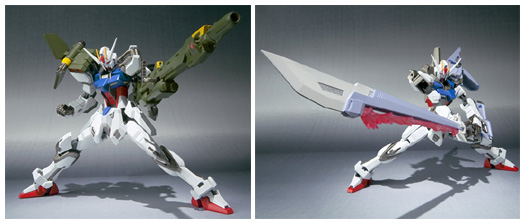 This parts set lets the Robot Damashii Side MS Aile Strike Gundam gear up into its long-range Launch Strike Gundam or melee-focused Sword Strike Gundam forms.