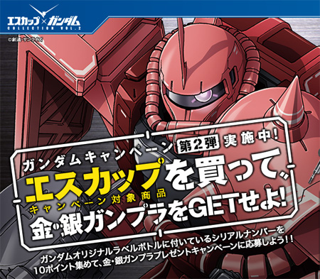 また、前回好評を得た「エスカップ×ガンダム」キャンペーンの第2弾として、「エスカップ ガンダム オリジナルラベル」に付属するシリアルナンバーを10ポイント分集めて応募すると、メガサイズモデルの「金銀ガンプラ シャア専用ザク」が抽選で当たるプレゼントキャンペーンもあわせて実施され、さらに落選した人にもPC・携帯電話用「エスカップ×ガンダム」オリジナル壁紙がもれなくプレゼントされる。