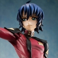 The "Mobile Suit Gundam SEED Athrun Zala" figure blends the face of a boy with the body of a soldier. His right hand can be displayed in a sharp salute, or flipped over as if reaching out for something. Also included are two navy blue Haros.