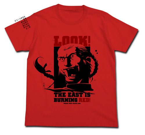 「東方は赤く燃えている!Tシャツ」は、東方不敗マスターアジアとその名台詞「見よ!東方は赤く燃えている!」の英訳をフロントにデザインし、袖には“流派東方不敗”の拳法家同士が出会った際に訓読する漢詩をプリントした1枚。