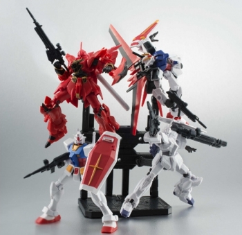 The lineup for the inaugural set is composed of the Gundam, Unicorn Gundam (Unicorn Mode), Sinanju, and Aile Strike Gundam. They're flexible enough to recreate their poses from the show, and come with stands for flight posing too!