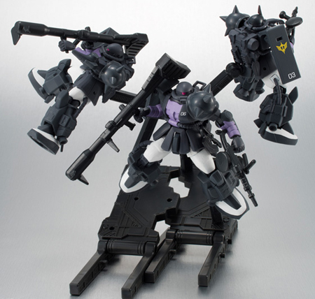 The palmtop-sized yet posable Assault KIngdom series returns with a second release in its EX series: a three-MS set of the Black Tri-Stars' Zaku IIs!