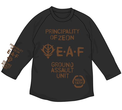 The Zeon EAF Raglan t-shirt carries prints for Zeon's Earth Assault Force, as well as their conquest of New Yark.