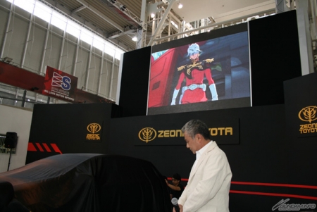発表会では、シャア・アズナブル役の声優、池田秀一氏にくわえ、ジオニックトヨタ特別広報部員のアイリン・フルカワことSKE48の古川愛李さん、さらにジオニックトヨタ特別サポーターとして、衆議院議員の平将明氏が登場。