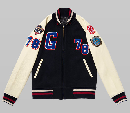 ボリューム感のある刺繍で胸に「G」と「78」のレタードワッペンがあしらわれ、袖には「ペガサス」、「地球連邦軍」のワッペンがデザインされている。身頃は海軍メルトン、袖はシュリンク加工を施したカウハイドレザーを使用。リブ(袖口などの伸縮部分)の形状もヴィンテージ仕様にこだわった、ガンダムファンならずとも納得の本格スタジャン。