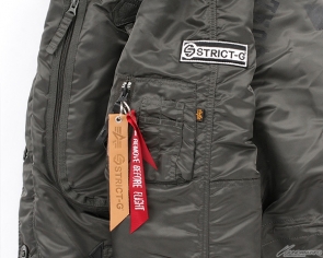 ▲右袖にはSTRICT-Gパッチ、リボンは牛革製のSTRICT-GとALPHAのコラボリボンが、通常の赤リボンとダブルで付属。左袖にはジオニック社とALPHA社のロゴパッチ。その品質を保証する「QUALITY EXCELLENCE」の文字が控え目ながら誇らしい。