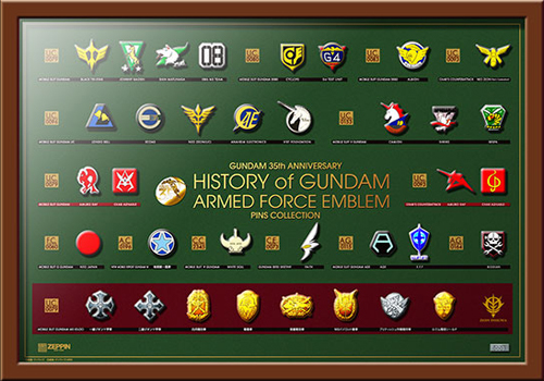 『機動戦士ガンダム』から『機動戦士ガンダムUC』まで、ガンダム35年の歴史より厳選された軍隊、部隊マーク、エンブレムを総覧するピンズセット。公式資料にのっとり、鉄・ステンレス製で細部まで忠実に再現され、裏面にはそれぞれの名称が刻印される。