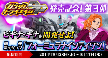 ミッションは、3DS「ガンダムトライエイジSP」発売記念の第3弾として配信されるもので、『機動戦士ガンダムF91』より「ガンダムF91」、「ビギナ・ギナ」、「ベルガ・ギロス(ザビーネ専用機)」の3機が襲来。見事ミッションをクリアすると、「ビギナ・ギナ」をビルドMSとして開発できるようになる。配信期間は9月17日(水)まで。